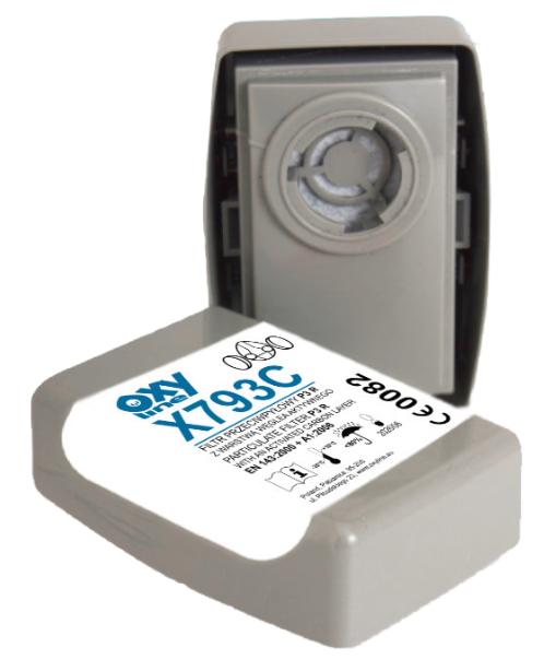 El filtro de cápsula X793C P3 R con una capa adicional de carbón activo, cuando se combina con una media máscara o máscara facial completa de dos filtros adecuada, protege el sistema respiratorio contra aerosoles sólidos no tóxicos y moderadamente tóxicos o aerosoles de base acuosa (polvo, humo, niebla), siempre que la concentración de aerosol disperso no supere 50 x OEL (límite de exposición profesional) cuando se combina con una media máscara y 1000 x OEL cuando se combina con una máscara facial completa.